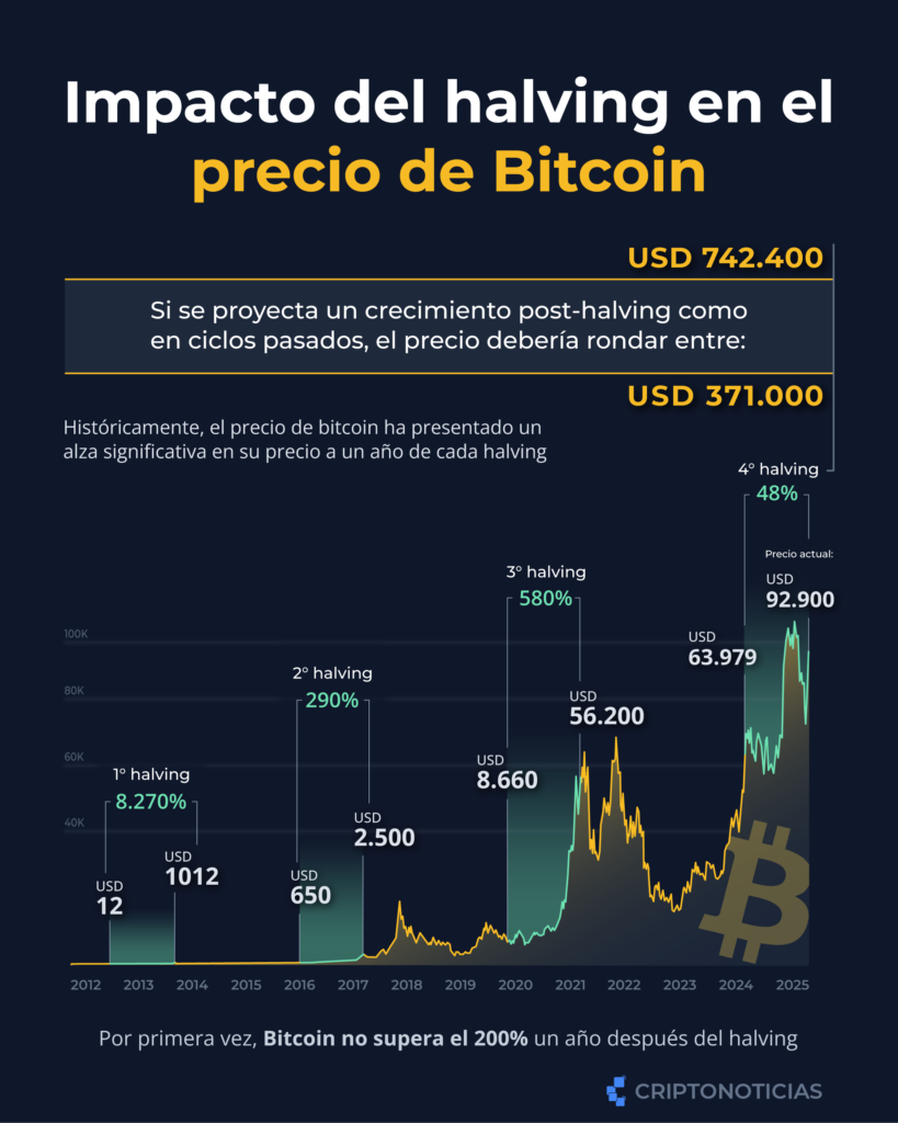 Esta subida de precios también parece ser natural, tomando en cuenta que bitcoin cumplió, el pasado 19 de abril, un año desde su último halving. Estos ciclos suelen tener impactos muy positivos en el precio. Aquí te mostramos una proyección de dónde debería estar el precio si siguiera los patrones de ciclos anteriores.