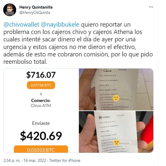Con respecto al envío de dinero desde el exterior, el desarrollador salvadoreño cree que las fallas que presentan los cajeros Chivo de bitcoin también representan un obstáculo para el envío de remesas de la diáspora a sus familias que permanecen en el país centroamericano.