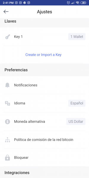 - Configura la moneda nacional en la que se verán los montos, sea dólares, euros, pesos, etc. El valor final de intercambio entre bitcoin y la moneda seleccionada dependerá de la casa de cambio que utilice la wallet como referencia.