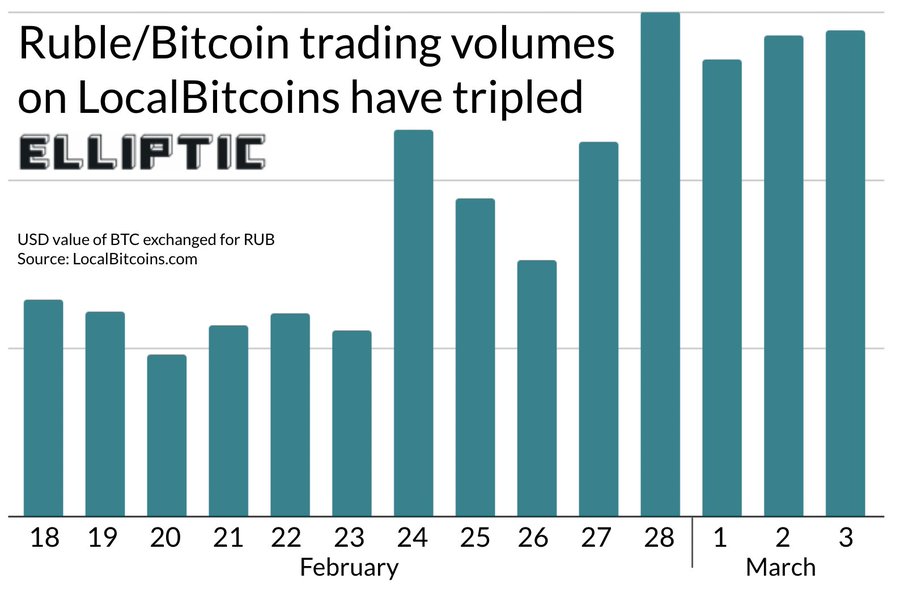 Algo que ha notado la firma en sus análisis, es que se han triplicado los volúmenes de intercambio de bitcoin entre pares en Rusia después de la invasión a Ucrania. El aumento es notorio a medida que la comunidad internacional presiona a Moscú a través de sanciones económicas, según lo informado por Tom Robinson, cofundador de Elliptic.