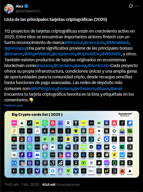 En 2025, al menos 112 tarjetas de criptomonedas compiten en el mercado, intensificando la batalla por captar el gasto diario de los usuarios. Así lo revela el investigador Alex Obchakevich en su exhaustivo listado de proyectos activos a nivel global.