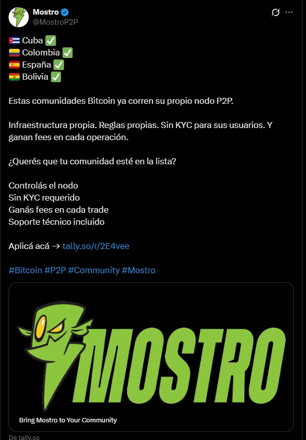 CriptoNoticias ha reportado que, apoyándose en el programa de “nodos confiables” de Mostro, en Cuba la comunidad Cuba Bitcoin activó el nodo denominado Kmbalache, una herramienta que permite el intercambio del activo digital incluso en condiciones de baja conectividad; por su parte, en Colombia el grupo ColombiaP2P se ha consolidado como la segunda organización en Suramérica en lanzar su instancia soberana bajo este protocolo.
