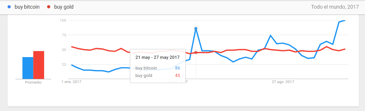 Desde entonces y hasta el día de hoy, las búsquedas de «Comprar bitcoin» son superiores en popularidad a las de «Comprar oro», registrándose el punto más alto en niveles de búsqueda entre el 27 de agosto y el 27 de septiembre. De esta forma, el promedio del interés a lo largo del tiempo con respecto a bitcoin en lo que va de este año es superior al respectivo promedio de búsquedas del metal precioso.