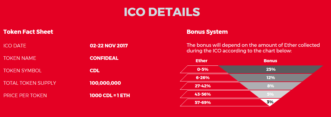 La ICO oficial de Confideal comenzarรก el 2 de noviembre de 2017 y el nรบmero mรกximo previsto de tokens que suministrarรกn serรก de 100.000.000 de CDL, con una suma total de 70.000 Ethereum a recaudar. Vea la tabla a continuaciรณn para atributos especรญficos, incluyendo la asignaciรณn de fondos y distribuciรณn de tokens;
