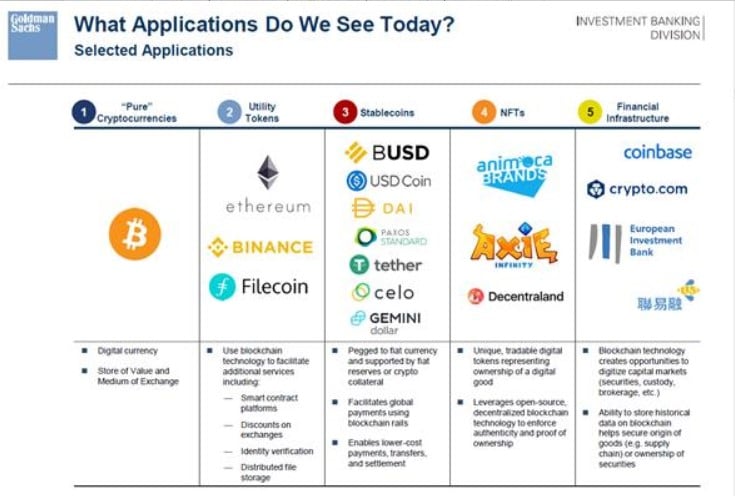 Siguiendo al Goldman Sachs, ether (ETH), la criptomoneda de Ethereum, Binance Coin (BNB), la criptomoneda del exchange centralizado Binance y Filecoin, son catalogadas como «tokens de utilidad».