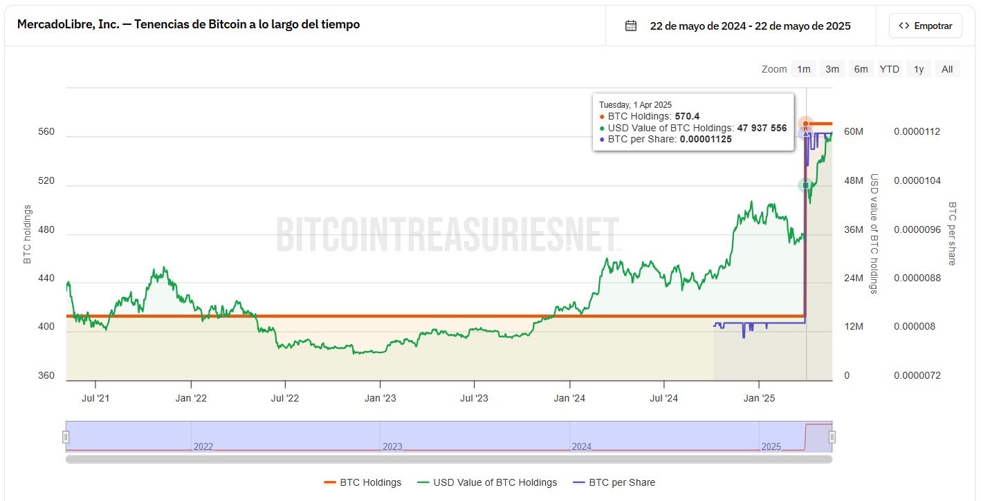 En su más reciente informe presentado ante la Comisión de Bolsa y Valores de Estados Unidos (SEC), Mercado Libre confirmó la adquisición de 157.7 BTC durante el primer trimestre de 2025, lo que elevó sus tenencias a 570.4 BTC.