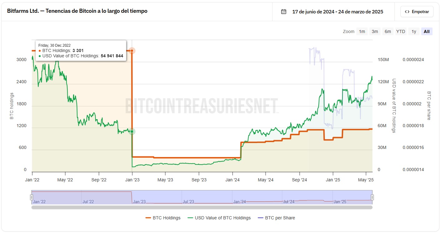 Bitfarms es una empresa centrada en la minería de bitcoin con sede en Canadá de origen argentino. De acuerdo con los números del explorador Bitcoin Treasuries, actualmente posee 1.166 BTC, valorados en unos USD 127.56 millones.