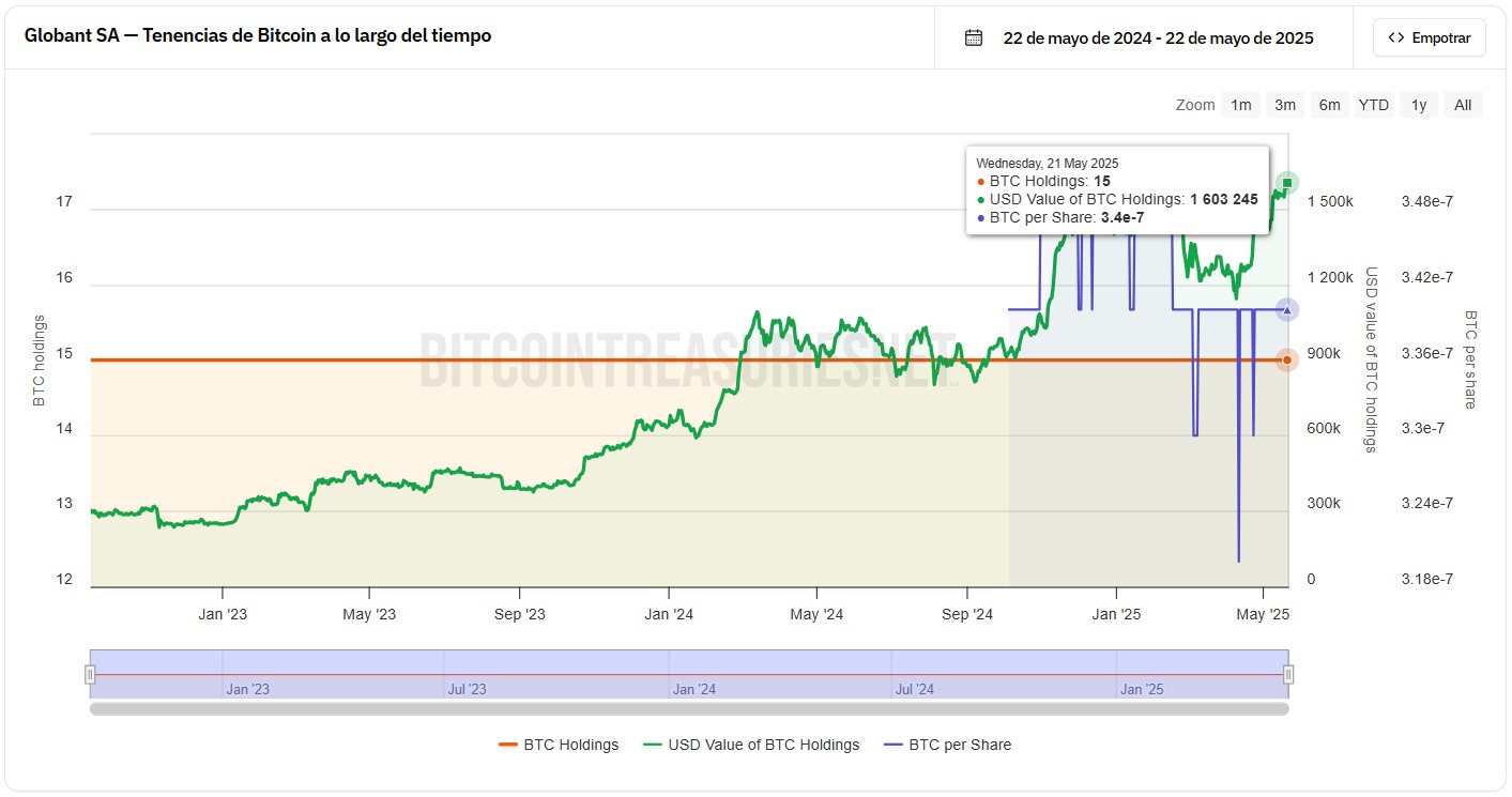 Aunque su sede legal está en Luxemburgo, Globant S.A. fue fundada en Argentina y actualmente mantiene una fuerte presencia operativa tanto en Buenos Aires como otras ciudades de América Latina. Cotizando en la Bolsa de Nueva York, la compañía posee actualmente 15 BTC, valorados en aproximadamente USD 1,67 millones, frente a una capitalización de mercado cercana a los USD 4,8 mil millones.