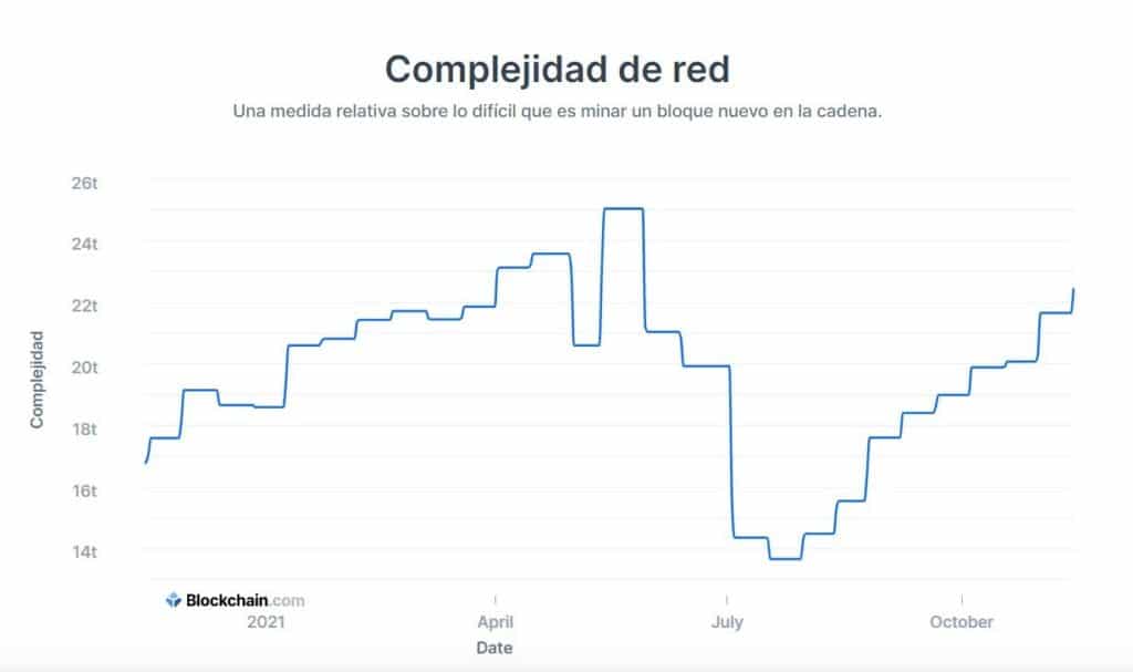 Prácticamente, con este aumento del 52%, la minería de bitcoin casi recupera el nivel de dificultad que tenía antes de su descenso en mayo. Tal como muestran los datos de Blockchain.com, en dicho mes comenzó a bajar el grado de complejidad hasta pisar fondo en julio con 13,6 T.