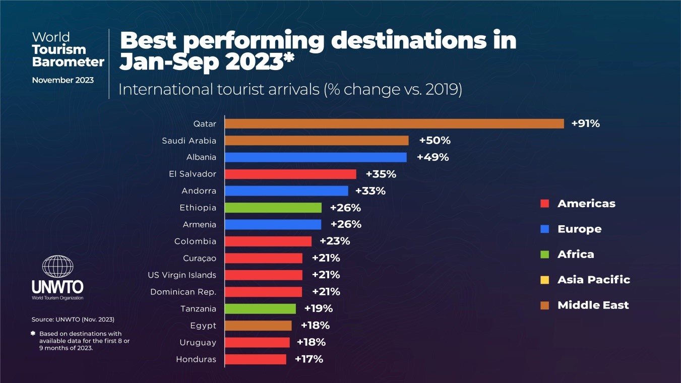 Según la organización, el país centroamericano supera a Colombia, República Dominicana, Uruguay y Honduras como el mejor destino turístico del 2023. Estos países vieron crecimientos de solo 23%, 21%, 18% y 17% desde el 2019, respectivamente.