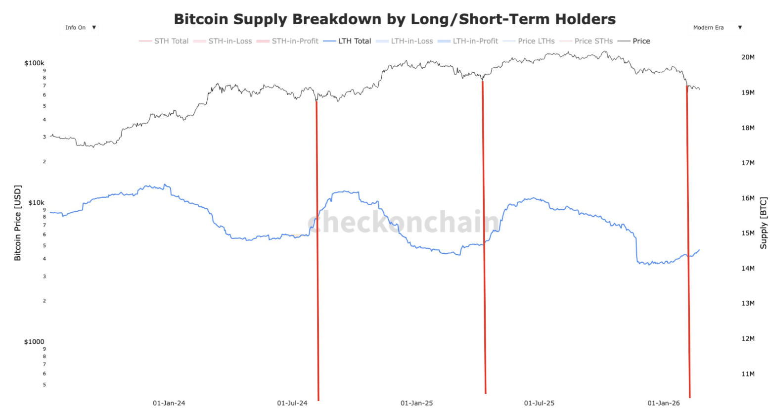 Aunque el suministro total en manos de este grupo suele situarse entre los 14 y 15 millones de BTC, la adiciรณn de 400.000 unidades en tres meses es significativa si se compara con la producciรณn de la red. Tras el halving de 2024, la red emite aproximadamente 450 nuevos BTC al dรญa; asรญ que el incremento que se visualiza en el grรกfico de Checkonchain equivale, por lo tanto, a casi dos aรฑos y medio de producciรณn minera de Bitcoin retirada de la circulaciรณn activa en apenas un trimestre.