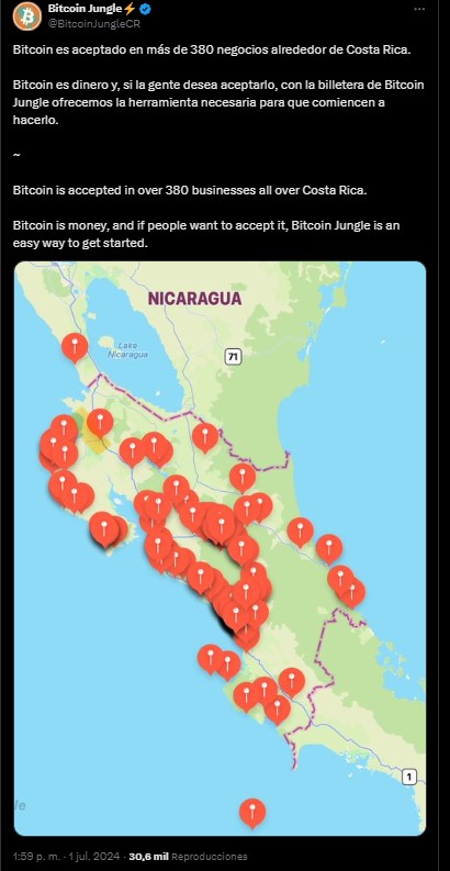 En julio del 2022, seis meses después de la fundación de Bitcoin Jungle, 30 locales del distrito Bahía Ballena comenzaron a aceptar pagos con bitcoin. Ahora, más 380 negocios están aceptando pagos en BTC, tal como lo informa en X el equipo detrás de la ciudadela.