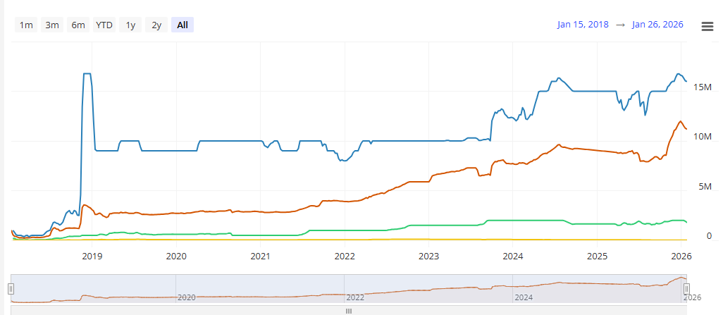 El impulso detrás de este crecimiento no es fortuito. A enero de 2026, la capacidad pública total de la Lightning Network oscila entre los 5.600 y 5.637 BTC, lo que equivale a unos 490 a 510 millones de dólares, según datos de Bitcoin Visuals. Este pico reciente revierte años de estancamiento, gracias en parte a las inyecciones de liquidez provenientes de grandes exchanges como Binance y OKX.