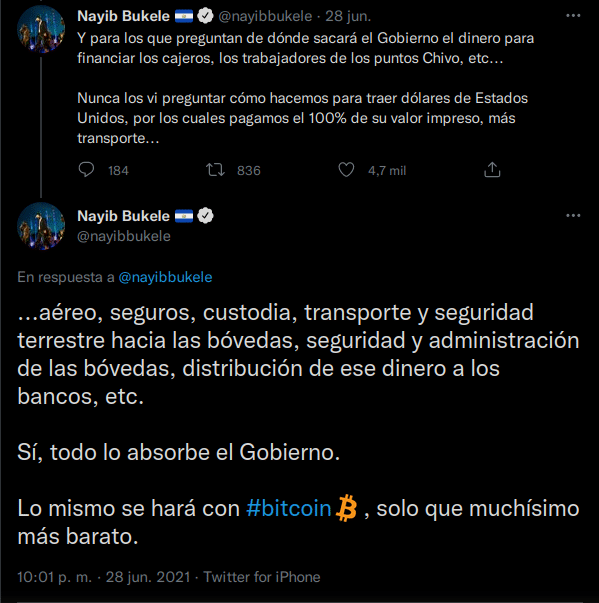 En el pasado, el presidente se ha referido al alto costo que el Gobierno asume al exportar dólares en efectivo y traerlos al país desde Estados Unidos. Sobre ello, ha dicho que la adopción de bitcoin es mucho más económica.