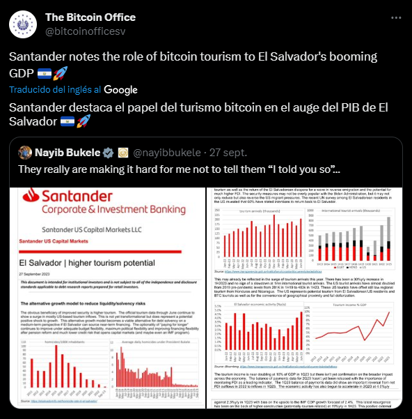 En su más reciente informe, la división de negocio de la institución, Santander Corporate & Investment Banking, destacó el aumento interanual de 30% del turismo hacia El Salvador, mucho de él impulsado por bitcoin.