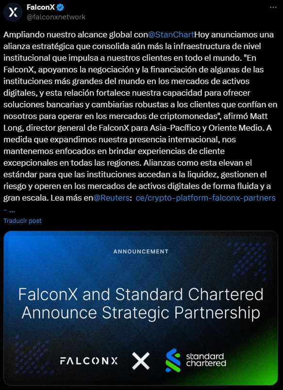 Esta colaboración representa la primera vez que FalconX —firma especializada en corretaje y comercio de bitcoin y criptomonedas— se asocia con un banco tradicional multinacional. Matt Long, director general de la compañía para Asia-Pacífico y Medio Oriente, declaró: «Nuestros clientes ahora podrán realizar liquidaciones en moneda fíat con más eficiencia, lo que se traduce en procesos más rápidos, una mejor utilización del capital y una reducción general del riesgo operativo». Vale destacar que FalconX, además de contar con el respaldo de inversionistas tradicionales como GIC, Wellington Management y Tiger Global, también posee el de gigantes del espacio de las criptomonedas, como Coinbase Ventures, Accel y Avon Ventures.