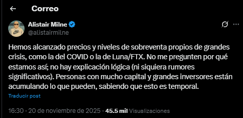 Ahora, en una publicación del 21 de noviembre de 2025, François manifiesta tener un sentimiento peor que durante el colapso del FTX y la crisis del COVID. «Sí, podemos bajar más, nadie sabe dónde está el fondo exacto. Pero en un par de años soñarás con comprar a estos precios», puntualizó.