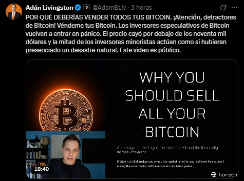 En medio del caos, Adam Livingston lanzó un video irónico que presentó con el título «por qué deberías vender todo tu bitcoin». Con tono sarcástico, el creador invita a los bajistas y turistas a venderle sus BTC mientras se burla de los que entran en pánico porque el precio cayó por debajo de los 90.000 dólares. Y el miedo extremo se apodera del mercado, como lo informó CriptoNoticias más temprano.