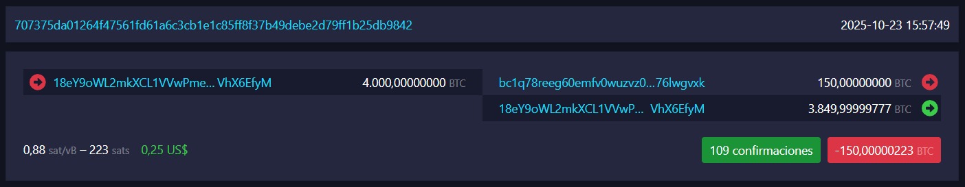 Según los registros de la red, el pasado 23 de octubre la dirección transfirió 150 BTC, equivalentes a unos 16,6 millones de dólares al precio actual del mercado. En junio de 2011, cuando acumuló tales monedas, su valor rondaba en torno a los 67.000 dólares.