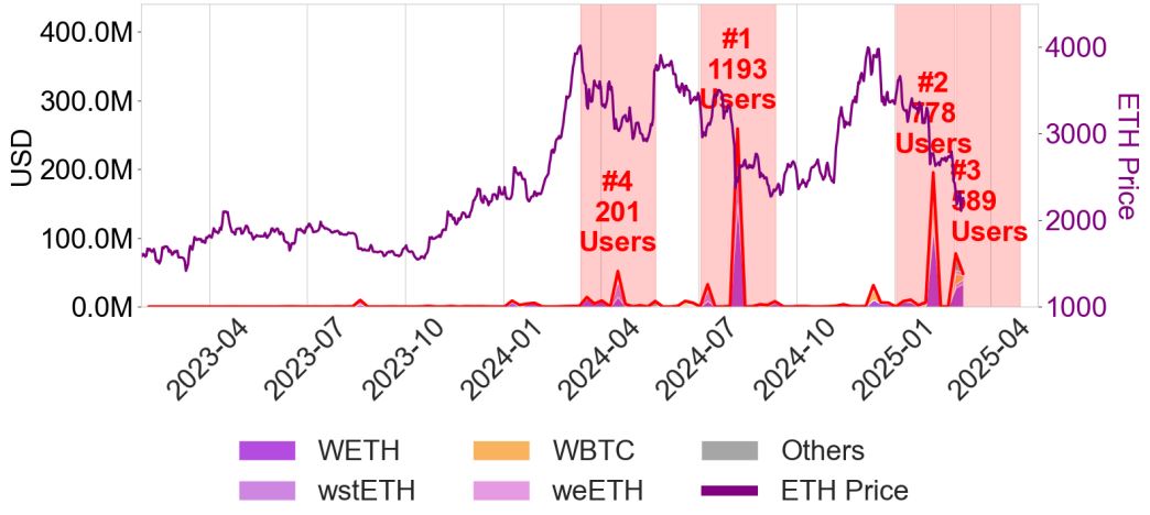 El segundo gráfico permite entender el principal riesgo del sistema. En la visualización, la línea roja representa el volumen total liquidado en dólares, mientras que las áreas de colores debajo corresponden a los principales activos involucrados en esas liquidaciones (como ether (ETH) y versiones envueltas de bitcoin). La línea violeta, por su parte, refleja el precio de la criptomoneda nativa de Ethereum.