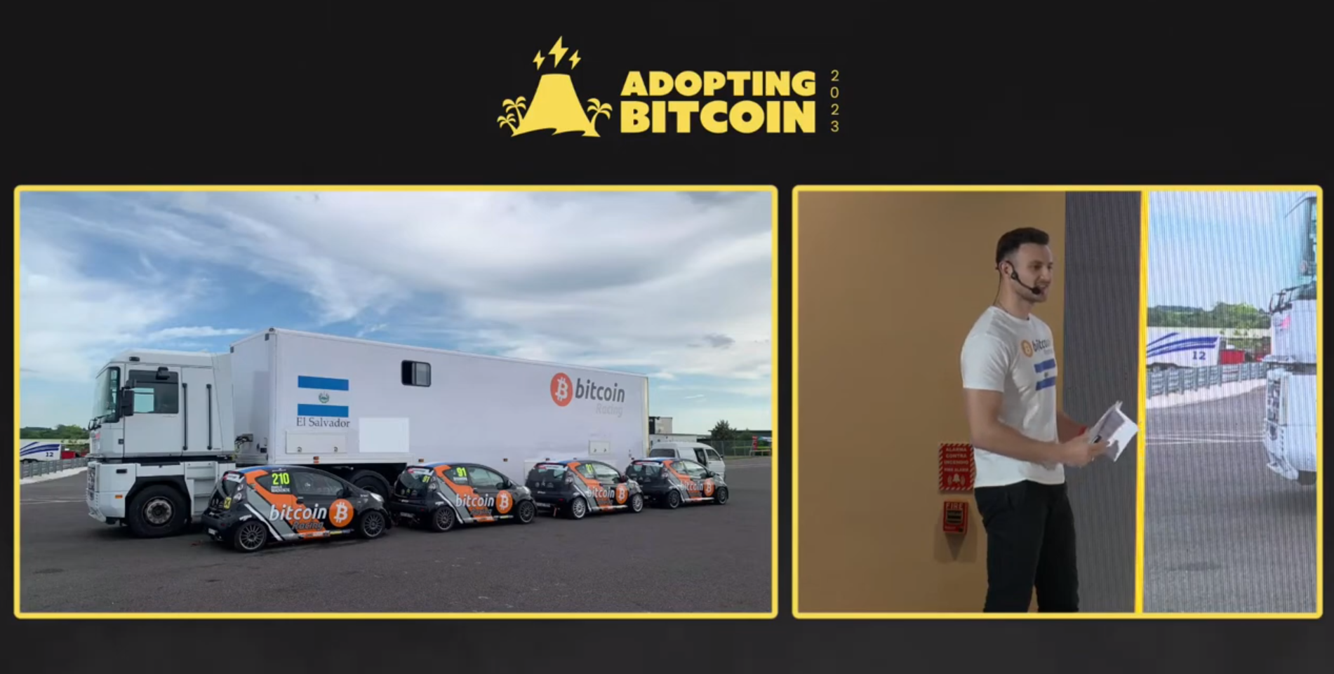 Los coches llevan a Bitcoin y a El Salvador como emblemas distintivos.