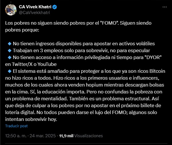 Sin embargo, no todos comparten la visiรณn optimista de Kiyosaki. Un usuario de X identificado como Vivek Khatri critica de manera contundente la visiรณn del escritor al seรฑalar que los pobres no permanecen en esa condiciรณn solo por FOMM, sino por barreras estructurales.
