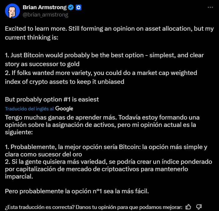 El CEO de Coinbase, Brian Armstrong, ha sido una de las personalidades que se ha pronunciado sobre el anuncio de Donald Trump de este domingo, en el que mencionó que XRP, solana (SOL) y cardano (ADA) formarán parte de la reserva de criptomonedas de EE. UU. Armstrong, en un post en la red social X, expresó que se tomará su tiempo para formar una opinión mejor definida, pero que actualmente considera a bitcoin como la mejor alternativa para integrar la tesorería, ya que es «la opción más simple y clara como sucesor del oro».