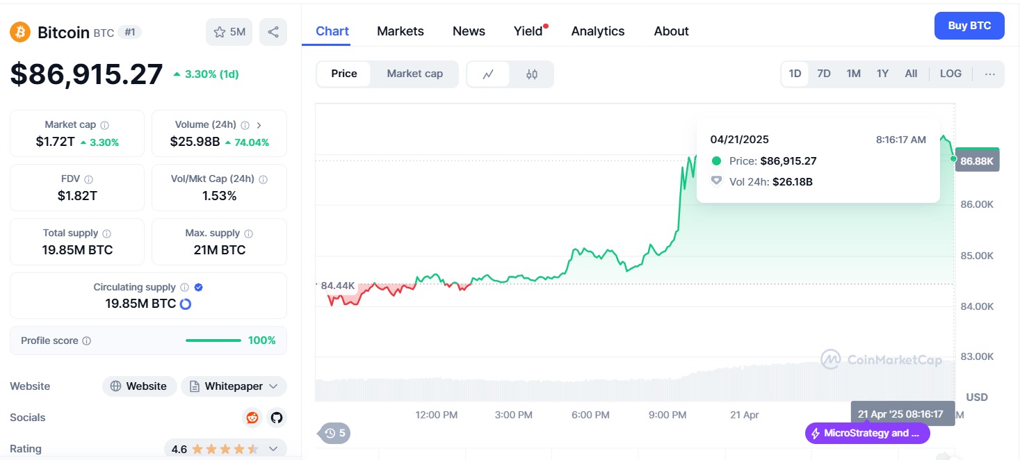Al momento de escribir esta nota, la creaciรณn de Satoshi Nakamoto cotiza en USD 86.915, segรบn datos de CoinMarketCap. Sin embargo, el precio llegรณ a superar los USD 87.600 en las รบltimas horas.