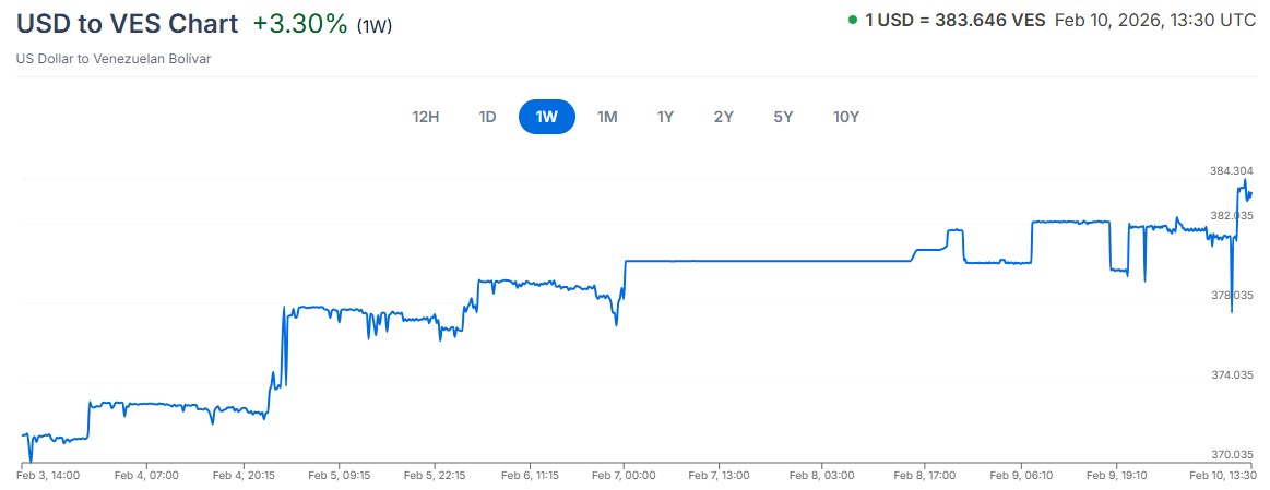 Por su parte, el dólar oficial, arbitrado por el Banco Central de Venezuela (BCV) ha registrado un incremento del 3% en siete días. Se sitúa sobre los 383 bolívares, tras aumentar desde los 371 bolívares. En la gráfica a continuación se aprecia mejor:
