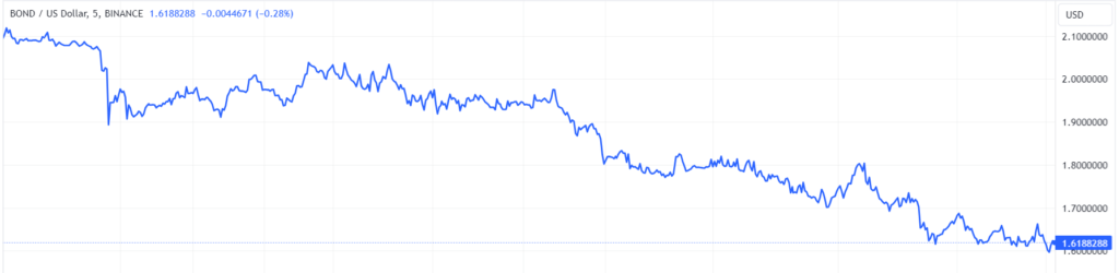 El token de gobernanza de la organización, BarnBridge (BOND), se ha visto perjudicado por la investigación de la SEC. Su precio cayó de USD 2,09 a USD 1,62 en la última semana, como se puede ver en el siguiente gráfico de TradingView: