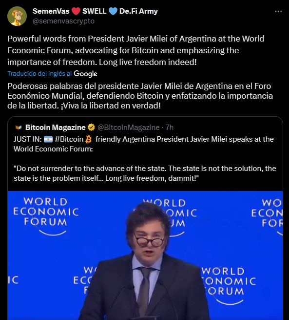 «Hay algo en la manera de hablar de Milei que me recuerda de fondo a la manera en la que está escrito «La filosofía de Bitcoin» de nuestro querido Álvaro D. María», comenta Antonio Muñiz en español. Como él expone, es fácil relacionar las palabras de Milei en Davos con los principios fundamentales de Bitcoin.