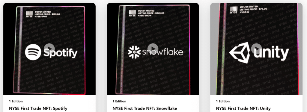 Estos tokens únicos representan 6 hitos importantes que este mercado de valores vivió recientemente: los listados de Spotify, Snowflake, Unity, DoorDash y Roblox; y el lanzamiento de Coupang, que fue la oferta pública inicial más grande de los Estados Unidos en lo que va de 2021. Los tokens, según se informa, ya están emitidos, aunque aún no fueron lanzados a la venta.