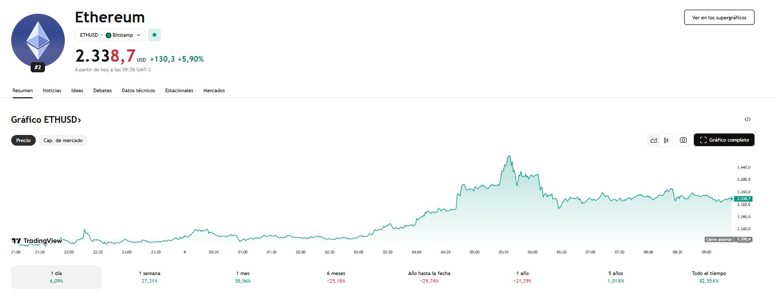 A pesar de unos últimos meses difíciles, la comunidad sigue contando con usuarios incondicionales y continúan llegando novedades en forma de actualizaciones. En los últimos días, dos temas han dominado la conversación en redes sociales: por un lado, el lanzamiento de su más reciente actualización, Pectra, considerada por algunos como un posible punto de inflexión para la red —tal y como reportó CriptoNoticias—; por otro, el repunte en el precio de ETH. Según números de TradingView, Ethereum se ha apreciado más de un 58% en el último mes, y para el momento de redactar esta nota su valor es de USD 2.339.