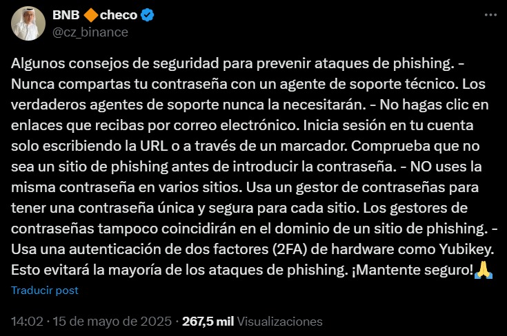 El caso llamo la atenciรณn de profesionales del sector, entre ellos Changpeng Zhao (CZ), ex CEO de Binance, quien compartiรณ en su cuenta de X una serie de recomendaciones para prevenir ataques de phishing. CZ destacรณ la importancia de no compartir contraseรฑas con supuestos agentes de soporte, evitar hacer clic en enlaces recibidos por correo electrรณnico y utilizar gestores de contraseรฑas para garantizar credenciales seguras en cada plataforma.