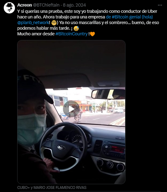Durante varios viajes de Uber, trasladó a figuras clave del ecosistema Bitcoin en El Salvador. Primero, una «maxi» que le advirtió sobre las shitcoins. Luego, a Noe, de la billetera Blink. Y finalmente, a Mario, un colaborador de la organización educativa Cubo+, quien lo vio y le dijo: «¿Sabes de tecnología? Por favor, aplica a este programa».