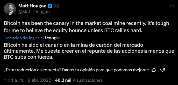 Así, Hougan no se queda corto y establece un paralelismo con el comportamiento de BTC durante la pandemia del Covid. «Vale la pena recordar que la última vez que tuvimos un verdadero caos económico, al inicio del Covid, bitcoin cayó a los USD 5.000 e incluso por debajo… Hoy estamos hablando de USD 80.000. Es un activo completamente distinto, con una distribución de propiedad institucional mucho más amplia».