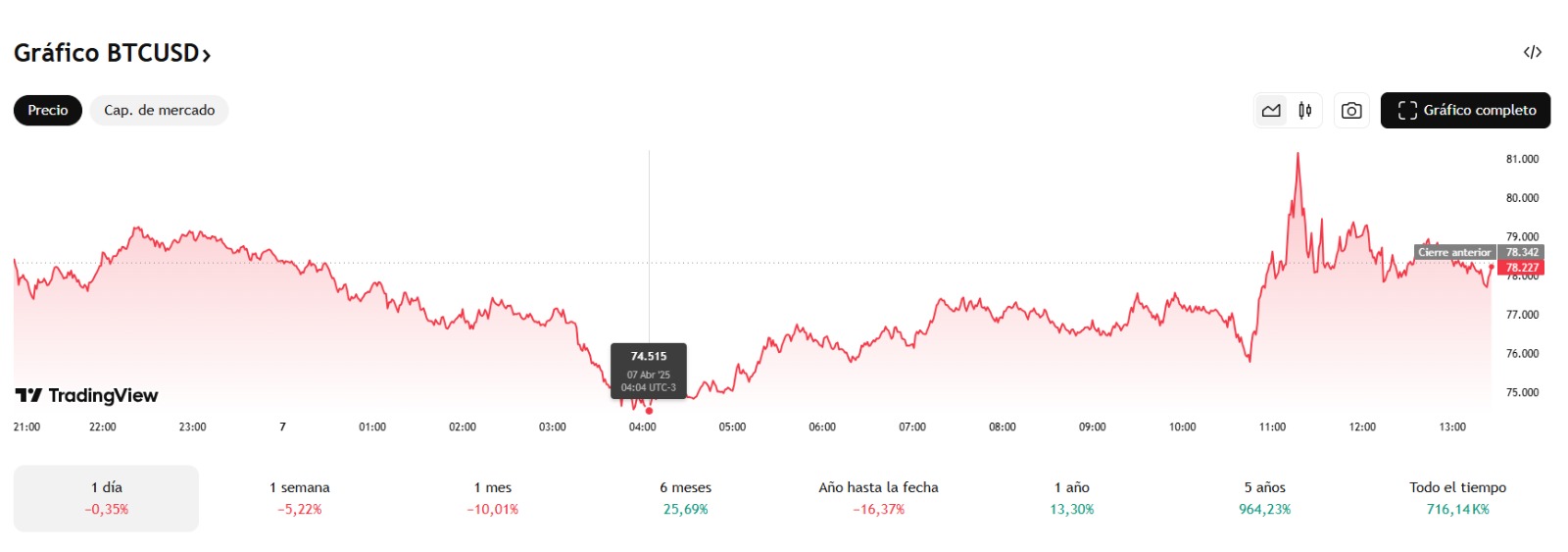 Según datos de TradingView, la criptomoneda líder cayó hasta los USD 74.515, lo que representa una baja de más del 30% con respecto a su máximo histórico registrado en febrero. Si bien bitcoin ya había rondado esa zona en las últimas semanas, esta vez se trata de su nivel más bajo en lo que va de año.