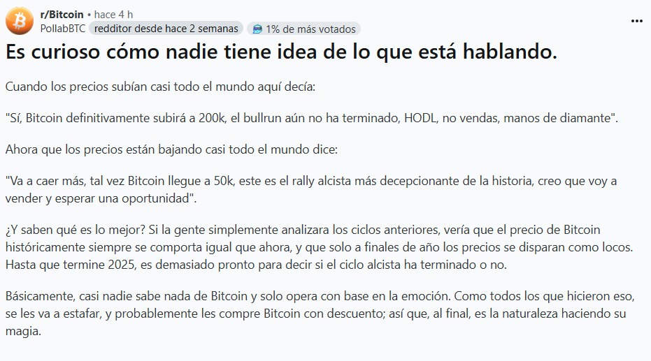 Finalmente, vale destacar una publicación de PollabBTC, quien señala con ironía cómo muchos usuarios del foro, hasta hace poco, daban por hecho que bitcoin alcanzaría los 200 mil dólares y que el bull run seguía firme, insistiendo en tener «manos de diamante». Sin embargo, ahora algunos de esos mismos usuarios sostienen que estamos ante el bull run más decepcionante de la historia. Según PollabBTC, si se analizan los ciclos anteriores se puede ver que bitcoin ha mostrado patrones muy similares. Por ello, pide dejar de operar con base en las emociones.