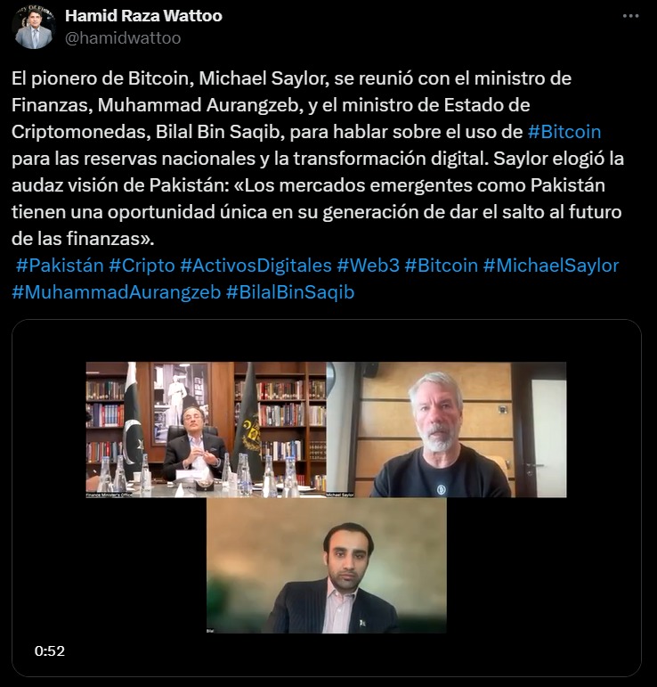El encuentro contó con la participación de Bilal Bin Saqib, ministro pakistaní encargado de asuntos relacionados con criptomonedas, y del ministro de finanzas, Muhammad Aurangzeb, con quienes se abordó el potencial de BTC como herramienta para una revolución digital sostenible del país.