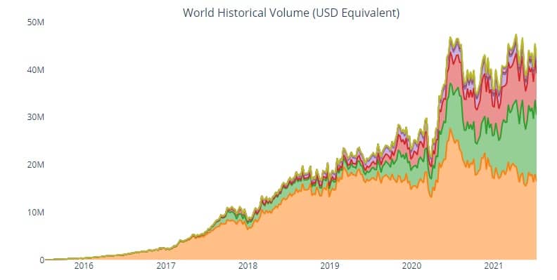 Históricamente, esta plataforma estuvo muy por debajo de los volúmenes que se manejaban en LocalBitcoins. Pero ahora, Paxful duplica el volumen semanal de su competencia, con casi 40 millones de dólares durante la semana más reciente. Y eso que Paxful no presta servicios a usuarios de Venezuela desde septiembre de 2020.