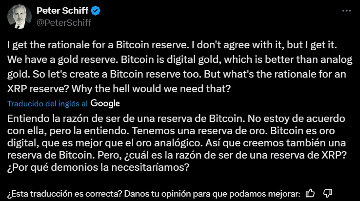 Schiff no está a favor de una reserva nacional basada en la criptomoneda líder, pero reconoce las razones detrás de su planteamiento, pues considera que BTC es «oro digital» y «mejor que el oro tradicional». Bajo esa lógica, si EE. UU. mantiene una reserva de oro, el especialista en finanzas puede aceptar la existencia de una de bitcoin. Sin embargo, el líder de Euro Pacific Capital fue categórico al cuestionar la inclusión del activo de Ripple, expresando: «¿Cuál es la razón de ser de una reserva de XRP? ¿Por qué demonios la necesitaríamos?».