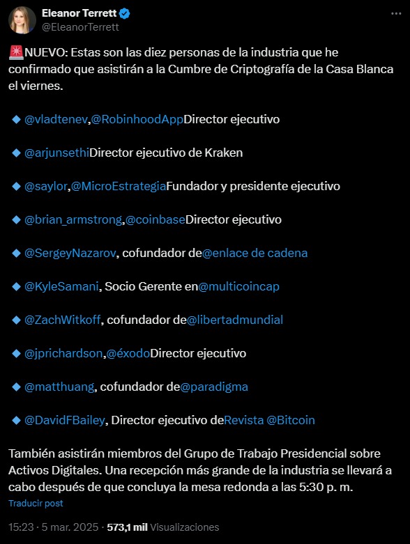 Según la periodista de FOX Business, Eleanor Terrett, también asistirán figuras destacadas como Brian Armstrong, CEO de Coinbase; David Bailey, director ejecutivo de Bitcoin Magazine; JP Richardson, CEO de Exodus; Sergey Nazarov, líder de Chainlink; Arjun Sethi, del exchange Kraken; y Bill Hughes, de Consensys, entre otras figuras.