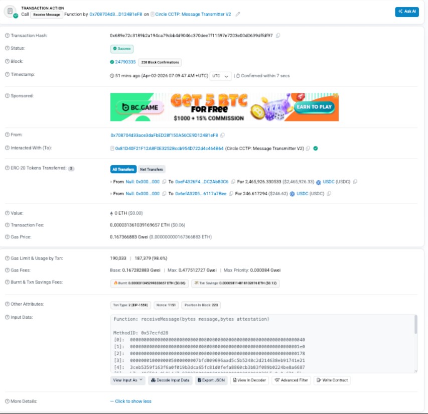 Se transfirieron más de USD 230 millones en USDC sustraídos a través del protocolo CCTP de Circle.