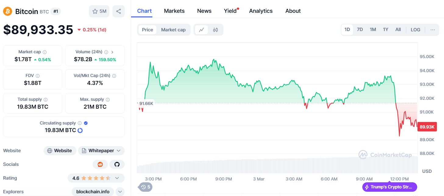En los últimos días, debido a diversos factores macroeconómicos, la criptomoneda líder había caído hasta los USD 78.000. Sin embargo, hace solo unas horas superó los USD 94.000, aunque recientemente ha retrocedido y se mantiene en torno a los USD 90.000, según datos de CoinMarketCap.