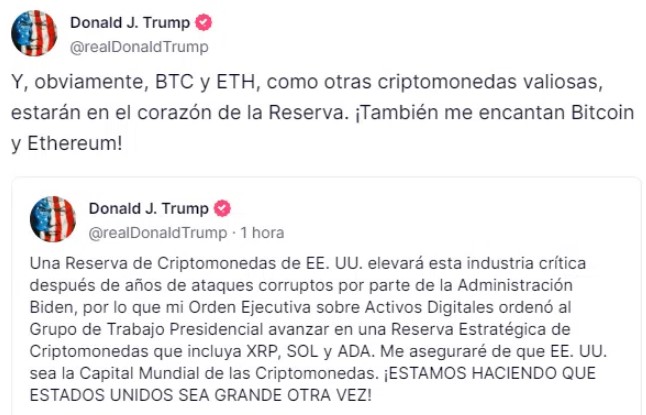Trump dijo que creará una reserva estratégica con XRP, Solana, Cardano, BTC y ETH.