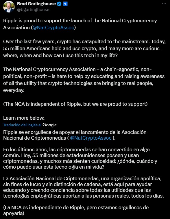 En su cuenta de X, el empresario aclaró que la NCA es independiente de Ripple, pero que aun así están orgullosos de apoyarla. Afirmó que «el objetivo de la organización es ayudar a través de la educación y la difusión de toda utilidad que las criptomonedas están brindando a las personas en su día a día».