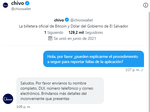 CriptoNoticias quiso confirmar si en efecto los usuarios son atendidos por esta vía. En efecto, hubo una primera respuesta solicitando el número del documento único de identidad (DUI) y detalles del incidente, pero posteriormente no hubo seguimiento. Se desconoce si la cuenta es controlada por mensajes automatizados.