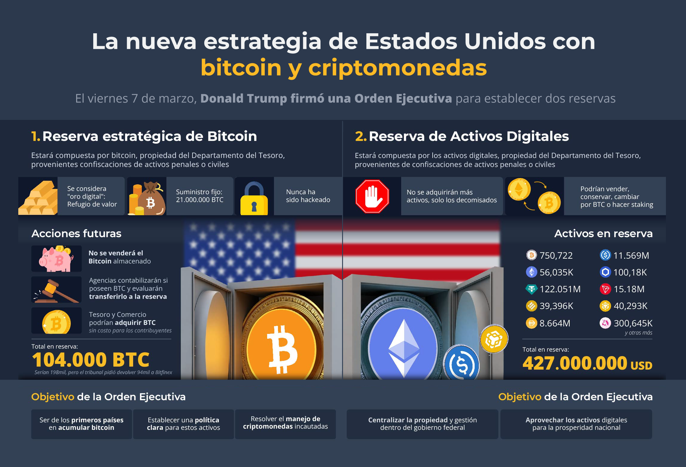 Con el decreto firmado, Trump confirmó que solo se utilizarán las criptomonedas bajo la custodia del gobierno provenientes de incautaciones, una cifra que asciende a aproximadamente 198.000 BTC.