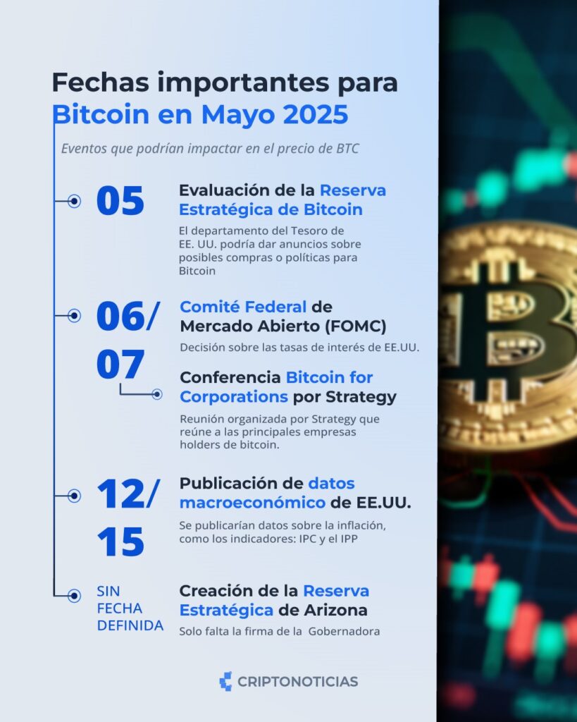 Este mes se preparan anuncios importantes que podrían impactar el precio. Uno de los principales es la reunión de la Reserva Federal (FED) de Estados Unidos, el próximo 6 de mayo, donde se decidirá sobre las tasas de interés. Se especula que la FED mantendrá las tasas actuales.