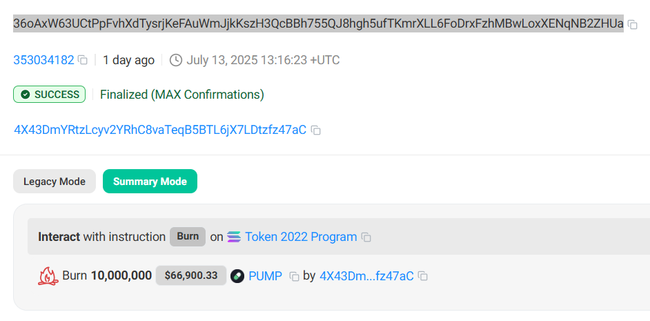 Un vistazo a la dirección 4X43DmYRtzLcyv2YRhC8vaTeqB5BTL6jX7LDtzfz47aC demuestra que, en efecto, su propietario envío 10.000.000 tokens PUMP a una dirección de quema. La acción del usuario interactuó con la función «BURN» del contrato Solana Token 2022 Program, ocasionando la pérdida definitiva de los casi 75 mil dólares.